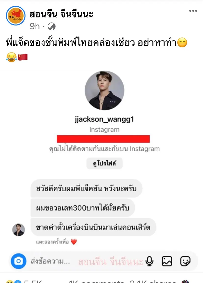 เกรียนมาก‼️ปลอมเป็น 'แจ็คสัน หวัง' พิมพ์ไทยขอเงิน 300 อ้างขาดค่าตั๋วเครื่องบิน พี่แจ็คพิมพ์ไทยคล่องจัง🤣
