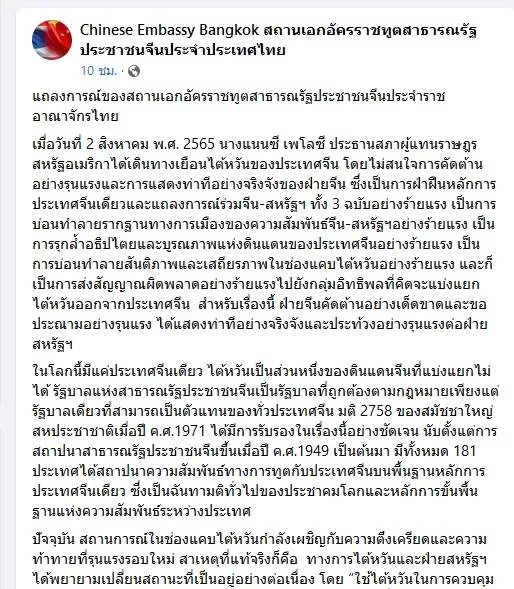 "เมื่อวันที่ 2 สิงหาคม พ.ศ. 2565 นางแนนซี เพโลซี ประธานสภาผู้แทนราษฎรสหรัฐอเมริกาได้เดินทางเยือนไต้หวันของประเทศจีน โดยไม่สนใจการคัดต้านอย่างรุนแรงและการแสดงท่าทีอย่างจริงจังของฝ่ายจีน ซึ่งเป็นการฝ่าฝืนหลักการประเทศจีนเดียวและแถลงการณ์ร่วมจีน-สหรัฐฯ ทั้ง 3 ฉบับอย่างร้ายแรง เป็นการบ่อนทำลายรากฐานทางการเมืองของความสัมพันธ์จีน-สหรัฐฯอย่างร้ายแรง เป็นการรุกล้ำอธิปไตยและบูรณภาพแห่งดินแดนของประเทศจีนอย่างร้ายแรง เป็นการบ่อนทำลายสันติภาพและเสถียรภาพในช่องแคบไต้หวันอย่างร้ายแรง และก็เป็นการส่งสัญญาณผิดพลาดอย่างร้ายแรงไปยังกลุ่มอิทธิพลที่คิดจะแบ่งแยกไต้หวันออกจากประเทศจีน สำหรับเรื่องนี้ ฝ่ายจีนคัดต้านอย่างเด็ดขาดและขอประณามอย่างรุนแรง ได้แสดงท่าทีอย่างจริงจังและประท้วงอย่างรุนแรงต่อฝ่ายสหรัฐฯ"