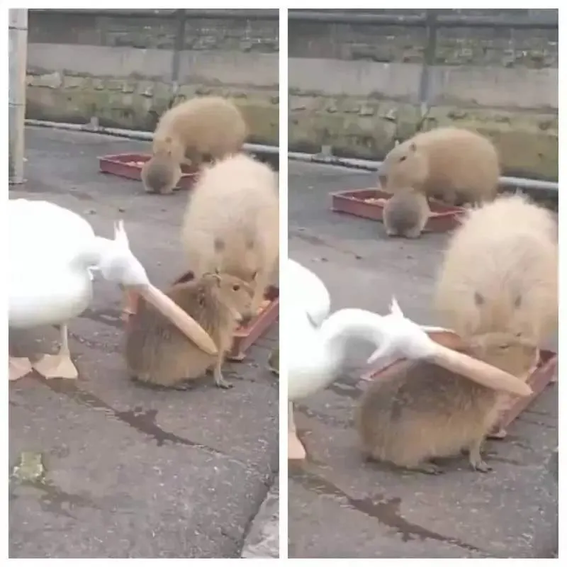 ねずみ年の主役カピバラをマッサージ❓するペリカン❗️