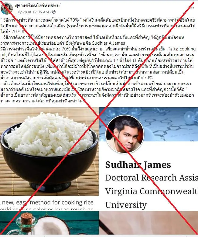 คำกล่าวอ้างที่ระบุว่าการอุ่นข้าวที่แช่เย็นหลังการหุงด้วยน้ำมันมะพร้าวจะช่วยลดปริมาณน้ำตาลในข้าวลงได้ถึง 70% ได้ถูกแชร์ออกไปทางเฟซบุ๊ก โพสต์อ้างเคล็ดลับการหุงข้าวนี้จากนักวิจัยชาวศรีลังกา พร้อมกล่าวว่างานวิจัยนี้ได้ถูกตีพิมพ์ลงวารสารการแพทย์