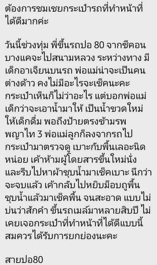 พอถึงป้ายตรงข้ามรพ.พญาไท 3 พ่อแม่ลูกก็ลงจากรถไป กระเป๋ามาตรวจดู เบาะกับพื้นเลอะนิดหน่อย เขาห้ามผู้โดยสารขึ้นใหม่นั่ง และรีบไปหาผ้าชุบน้ำมาเช็ดเบาะ นึกว่าจะจบแล้ว เขากลับไปหยิบม็อบถูพื้น ชุบน้ำแล้วมาเช็ดพื้นจนสะอาด แบบไม่บ่นว่าสักคำ ขึ้นรถเมล์มาหลายสิบปี ไม่เคยเจอกระเป๋าที่ทำหน้าที่ได้ดีแบบนี้ สมควรได้รับการยกย่องนะคะ สายปอ.80 6-55001 12-4693