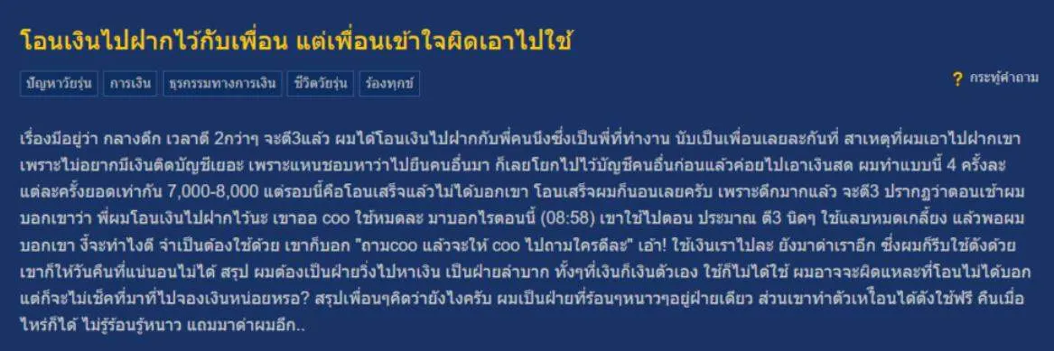 หนุ่มคนหนึ่งตั้งกระทู้ถามว่า เรื่องมีอยู่ว่า กลางดึก เวลาตี 2 กว่าๆ จะตี 3 แล้ว ผมได้โอนเงินไปฝากกับพี่คนนึงซึ่งเป็นพี่ที่ทำงาน นับเป็นเพื่อนเลยละกันที่สาเหตุที่ผมเอาไปฝากเขา