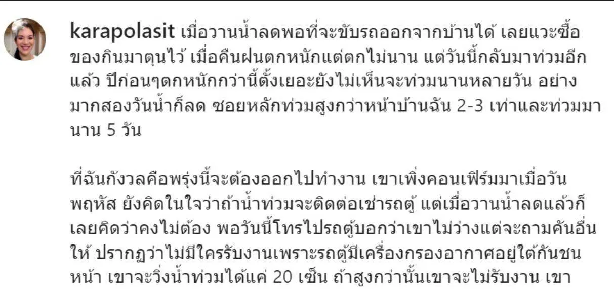 พร้อมระบุอีกว่า ที่ฉันกังวลคือพรุ่งนี้จะต้องออกไปทำงาน เขาเพิ่งคอนเฟิร์มมาเมื่อวันพฤหัส ยังคิดในใจว่าถ้าน้ำท่วมจะติดต่อเช่ารถตู้ แต่เมื่อวานน้ำลดแล้วก็เลยคิดว่าคงไม่ต้อง พอวันนี้โทรไปรถตู้บอกว่าเขาไม่ว่างแต่จะถามคันอื่นให้ ปรากฏว่าไม่มีใครรับงานเพราะรถตู้มีเครื่องกรองอากาศอยู่ใต้กันชนหน้า เขาจะวิ่งน้ำท่วมได้แค่ 20 เซ็น ถ้าสูงกว่านั้นเขาจะไม่รับงาน เขาแนะนำให้ฉันเรียก Grab Taxi โดยเลือกเป็นรถสูง เช่น Fortuner
