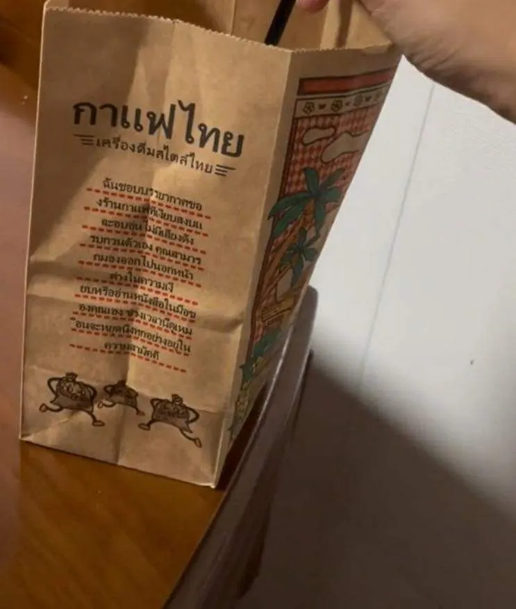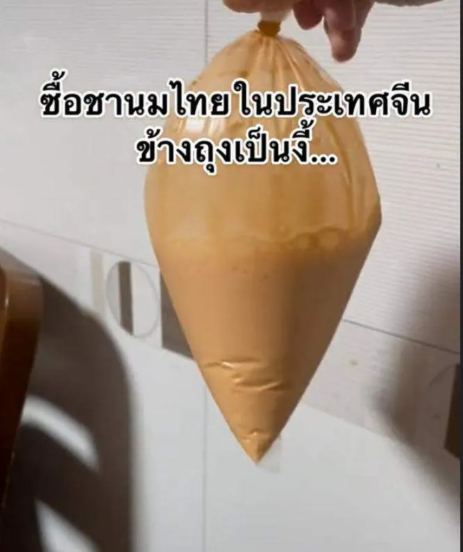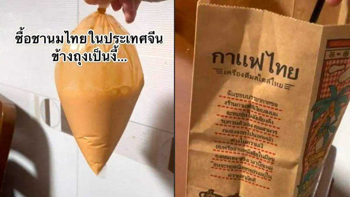จากคลิปเผยสาวซื้อชานมไทยที่ประเทศจีน แพ็คเกตเหมือนไทยเป๊ะ มีถุงกระดาษใส่ให้ด้วย พร้อมข้อความเป็นภาษาไทยข้างถุงกระดาษ ที่คนไทยอ่านแล้วถึงกับหัวจะปวด