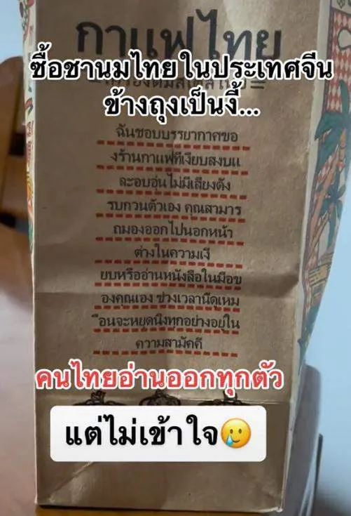 สาวไทย เผยคลิป "ซื้อชานมที่ประเทศจีน" พร้อมถุงข้อความภาษาไทยข้างถุงกระดาษ ที่คนไทยอ่านแล้วมึนตึ๊บ
