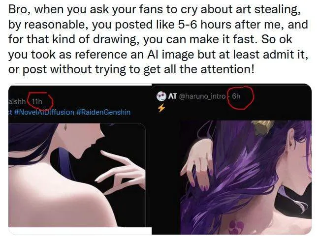 โดยมีนักวาดชาวเกาหลีท่านหนึ่งนามว่า at80zero ได้ทำการไลฟ์วาดรูปตัวละคร Raiden Shogun จาก Genshin Impact บน Twitch เพื่อให้เหล่าผู้ติดตามได้ชมขั้นตอนการทำงาน และโพสต์ภาพที่เสร็จสิ้นบน Twitter ส่วนตัวตามปกติ แต่กลายเป็นว่า ในระหว่างที่ไลฟ์ มีบัญชีผู้ใช้งาน Twitter รายหนึ่งนามว่า musaish ได้เข้าบันทึกภาพหน้าจอตอนไลฟ์ของ at80zero ในขณะที่ยังวาดไม่เสร็จ แล้วนำภาพนั้นไปใส่ใน NovelAI เพื่อสร้างเป็นภาพของตัวเอง แล้วชิงโพสต์ตัดหน้าในช่องทางของตัวเอง ก่อนที่เจ้าของภาพจริงจะโพสต์ผลงานเสร็จหลายชั่วโมง