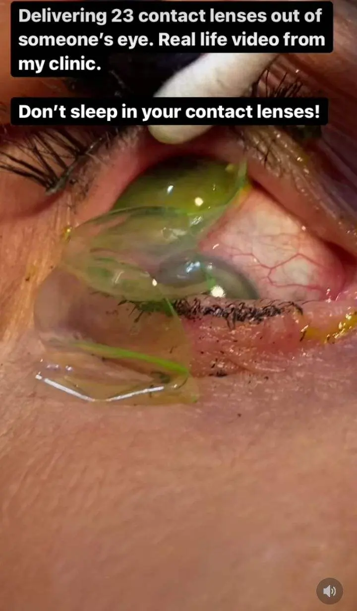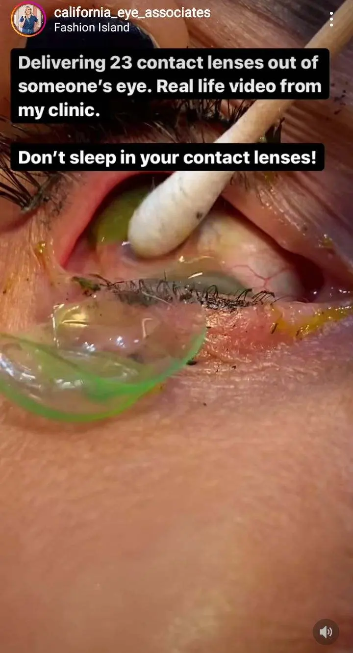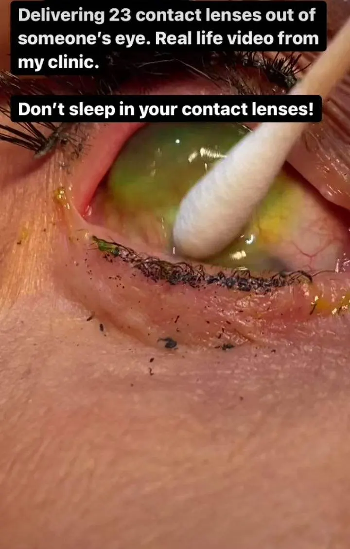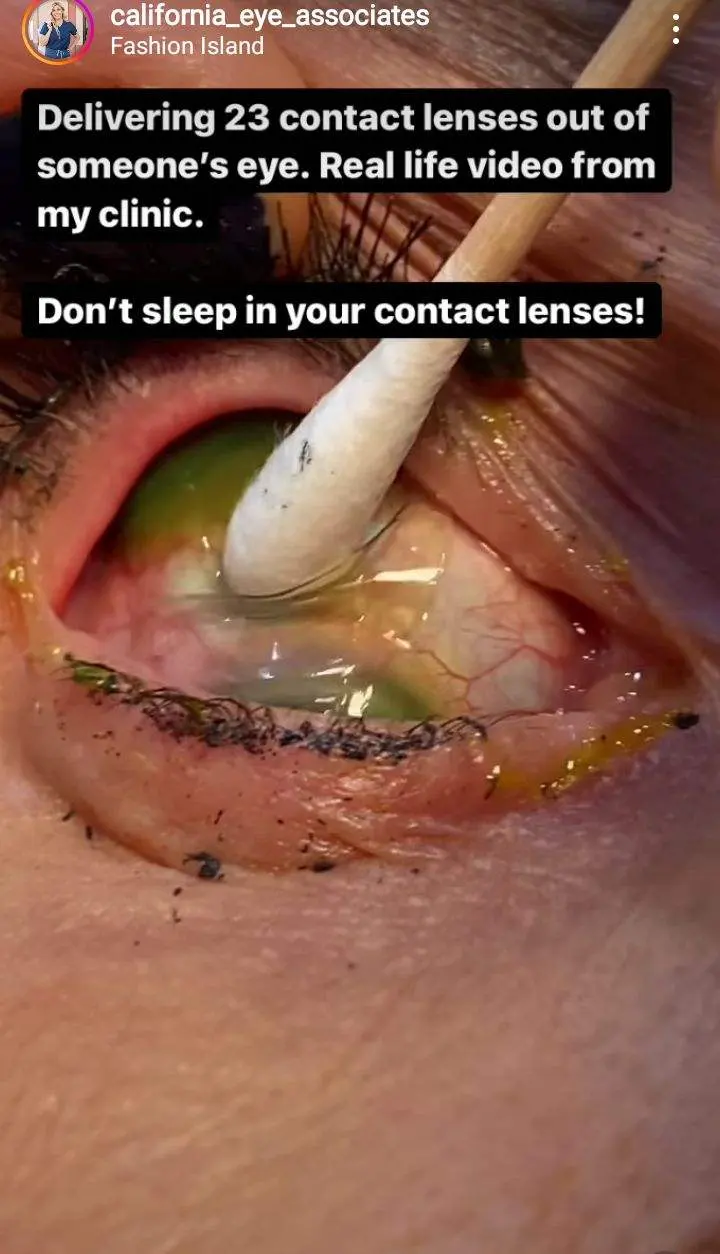 คอนแทคเลนส์นับได้รวม 23 อัน จากตาของคนไข้ซึ่งเป็นหญิงสูงอายุ ซึ่งคาดว่าอาจจะลืมถอดคอนแทคเลนส์ จนคอนแทคเลนส์เลื่อนไปอยู่ในลูกตาของเธอ และใส่คอนแทคเลนส์คู่ใหม่เข้าไปเรื่อยๆ จนคอนแทคเลนส์เข้าไปติดอยู่ในลูกตา บางอันเก่ามากจนกลายเป็นสีเขียว แต่ละอันซ้อนติดกันและไปหลบอยู่ใต้เปลือกตามาเป็นเดือน