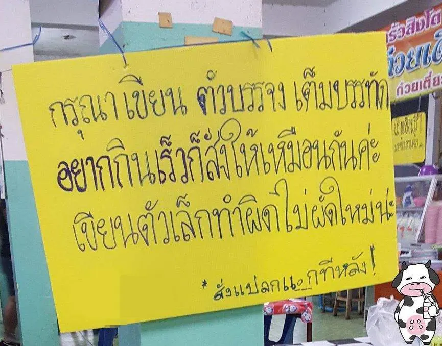 เพจ “ผู้บริโภค” ได้โพสต์ภาพบ้ายที่ติดไว้ที่ร้านอาหารตามสั่งร้านหนึ่ง เขียนติดไว้แจ้งลูกค้าที่จะมาเขียนสั่งอาหารลงในกระดาษจดออร์เดอร์ ขอให้ลูกค้าเขียนตัวใหญ่ๆ อ่านได้ชัดๆ และหากอยากได้อาหารเร็วๆ ก็ควรสั่งเมนูที่เหมือนกับลูกค้าคนอื่นๆ โดยข้อความในป้ายระบุว่า