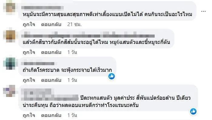 โดยใช้เทคโนโลยี ลดพื้นที่ ลดการใช้คน เพิ่ม Economy of Scale พูดเป็นเล่นไป เอาไปใช้กับพวกตึกร้างทั่วจีนได้นะเนี่ย งานนี้ทำเอาชาวเน็ต ต่างเข้ามาแสดงความเห้นกันมากมายเช่นทุกวันนี้คนบริโภคเนื้อสัตว์ที่เลี้ยงจากฟาร์มก็เป็นสาเหตุหลักที่ก่อเกิดโรคมากมายอยู่แล้ว นี่ยิ่งมาจากการเลี้ยงในคอนกรีตและเพิ่มเทคเข้าไปอีก บ้างก็บอกว่านึกถึงกลิ่นตอนขับรถผ่านฟาร์มหมู เป็นต้น