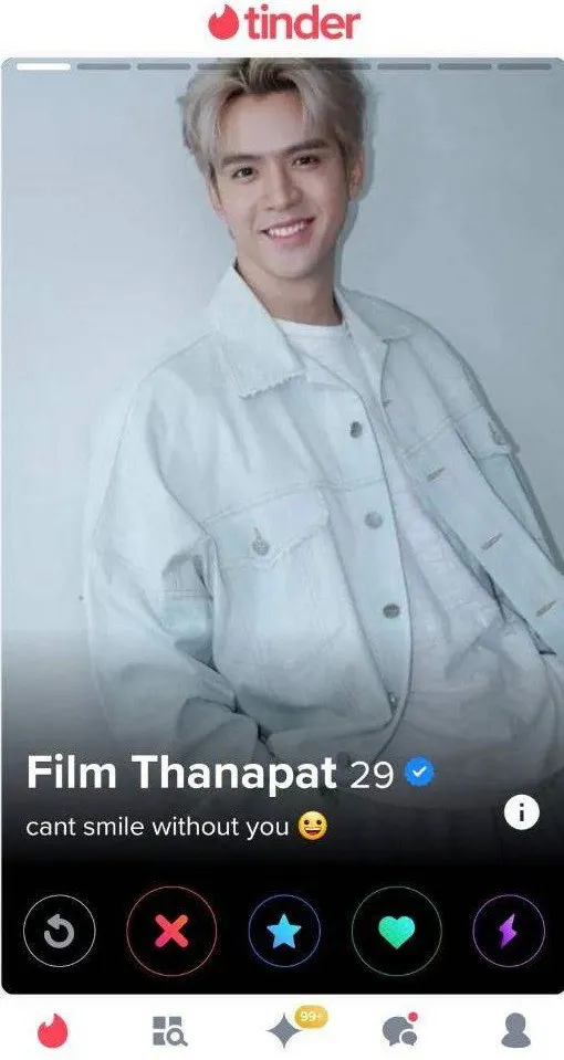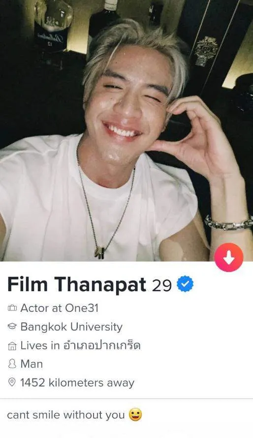 ทวิตเตอร์ของฟิล์ม ธนภัทร ได้แชร์ภาพที่ชาวเน็ตรายหนึ่งถามว่า เพื่อนๆ คะ ดาราเขาเล่นทินเดอร์กันไหมอ่ะ นี่ปัดแล้วเจอฟิล์ม ธนภัทร นาทีแรกเหมือนเจอเข็มในมหาสมุทร เป็นฟีลรักแรกพบ นาทีต่อมาคือลังเลว่าตัวจริงหรือเปล่า ขอถามความเห็นชาวเน็ตก่อนรีพอร์ตค่ะ