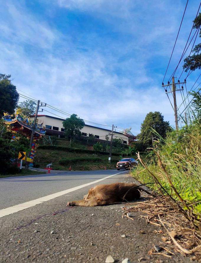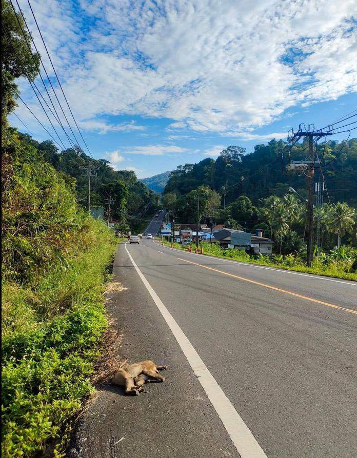 "ไม่มีใครไม่เศร้าถ้าเห็นภาพแบบนี้ ใช่ครับรถชน แต่ต้นเหตุที่ทำให้เกิด คือสิ่งที่ต้องนำมาคิด ลิงกำลังข้ามถนน รถคงขับเร็ว จะเบรกก็คงกะทันหัน จุดนี้โค้งลงเนิน (ศาลเจ้าพ่อเกาะช้าง) และจุดนี้มีลิงอยู่ข้างทางบ้างบางครั้ง แม้จะไม่ค่อยมีใครให้อาหารลิงจุดนี้ แต่พฤติกรรมของลิงเปลี่ยนไป โดยเฉพาะที่พิกัดอื่นที่ใกล้นักท่องเที่ยว เช่น จุดชมวิว หรือข้างทางบนภูเขาหลายจุด ยังมีการให้อาหารลิง ทั้งๆ ที่มีป้ายห้ามติดอยู่ มีการรณรงค์ไม่ให้อาหารลิง แต่ก็ยังมีลักลอบให้อาหารลิงอยู่บ่อยครั้ง