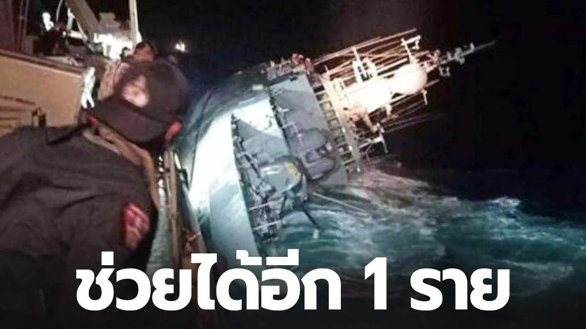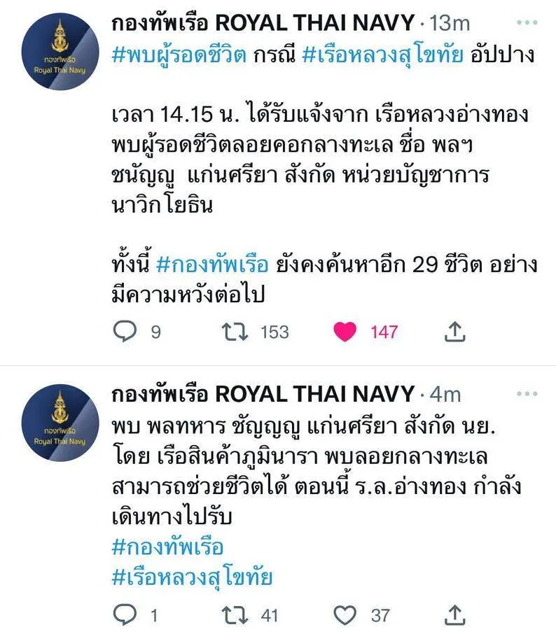 กองทัพเรือแจ้งข่าวความคืบหน้า กรณีเรือหลวงสุโขทัยเจอคลื่นลมแรง น้ำทะเลไหลเข้าเรือจนทำให้เรือเอียงและจมลงใต้ทะเล โดยพบผู้รอดชีวิตเพิ่ม 1 ราย คือ พลทหาร ชนัญญู แก่นศรียา สังกัดหน่วยบัญชาการนาวิกโยธิน ผู้ประสบเหตุเรือหลวงสุโขทัยล่ม ปลอดภัยดี เรือหลวงอ่างทอง เข้าช่วยเหลือเเล้ว