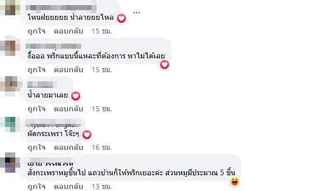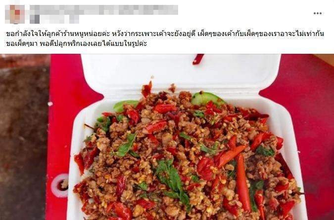 “ขอกำลังใจให้ลูกค้าร้านหนูหน่อยค่ะ หวังว่ากระเพาะเขาจะยังอยู่ดี เผ็ดๆของเขา กับเผ็ดๆของเราอาจจะไม่เท่ากัน ขอเผ็ดๆมา พอดีปลูกพริกเองเลยได้แบบในรูปค่ะ”