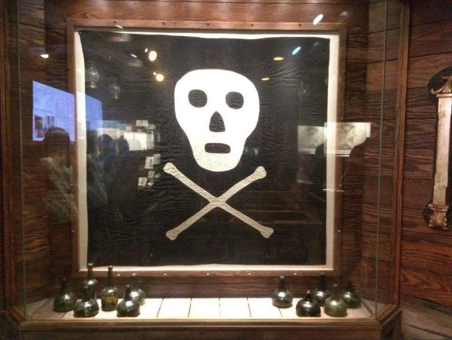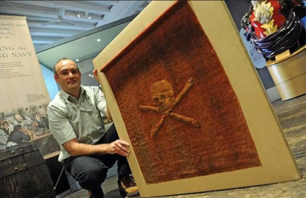 นี่คือภาพธงโจรสลัด แบบหัวกะโหลกกระดูกไขว้ ของแท้ที่ยังหลงเหลือในปัจจุบัน