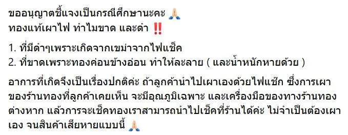 อาการที่เกิดจึงเป็นเรื่องปกติค่ะ ถ้าลูกค้านำไปเผาเองด้วยไฟแช๊ก ซึ่งการเผาของร้านทองที่ลูกค้าเคยเห็น จะมีอุณภูมิเฉพาะ และเครื่องมือของทางร้านทองต่างหาก แล้วการจะเช็คทองเราสามารถนำไปเช็คที่ร้านได้ค่ะ ไม่จำเป็นต้องเผาเอง จนสินค้าเสียหายแบบนี้