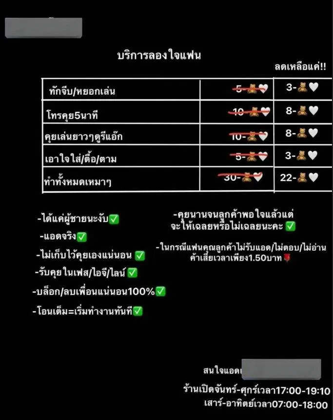 อัตราค่าบริการถูกมาก!! เช่น ทักหยอดไปจีบ 3 บาท, โทรคุย 5 นาที 8 บาท, คุยยาวๆดูท่าที 8 บาท, เอาใจใส่ ตามตื๊อ 3 บาท “หรือจะทำทั้งหมดเหมาๆก็เพียง 22 บาทเท่านั้น!”