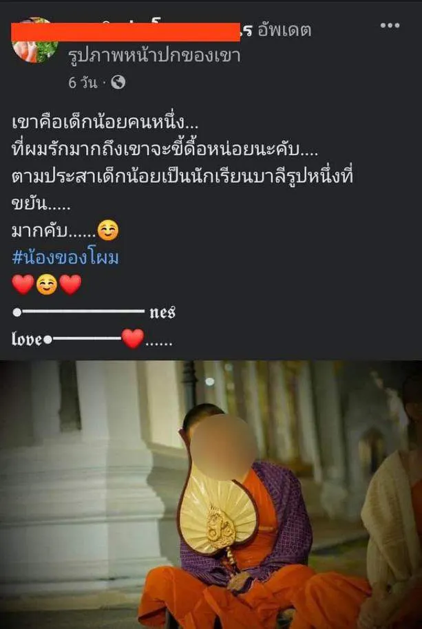 นอกจากนี้ยังมีโพสต์ในโซเชียล เป็นรูปของชายในจีวร ระบุแคปชันว่า “เขาคือเด็กน้อยคนหนึ่ง ที่ผมรักมากถึงเขาจะขี้ดื้อหน่อยนะ ตามประสาเด็กน้อยเป็นนักเรียนบาลีรูปหนึ่งที่ ขยันมากครับ”