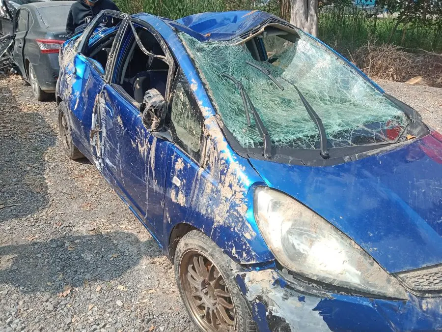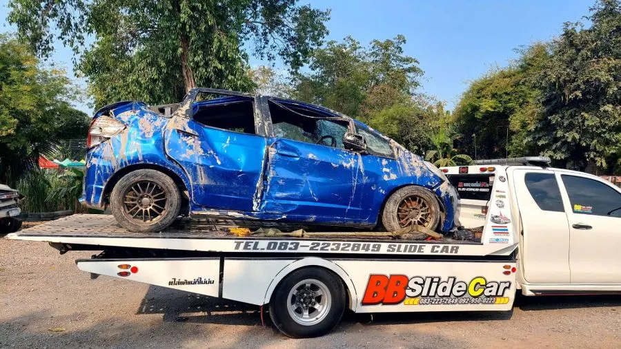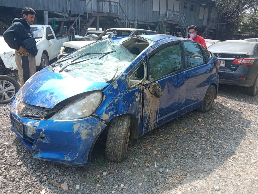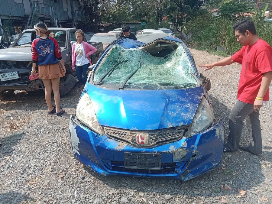จนได้ไปเจอรถที่ สภ.อยุธยา ตอนแรกเมียคนที่ชนบอกว่า แค่ชนป้ายข้างทาง กระจกแตก ล้อแตก เราก้อคิดว่ารถเราคงไม่เปนอะไรมาก จนวันพุธ เราไป สภ.อยุธยา ถึงกับเข่าทรุด รถเราเป็นถึงสภาพนี้ ทางคนที่เอาไปชนบอกกับเราว่า วันนั้นเขาไปอยุธยาเพื่อไปคุยงาน และบอกว่าไม่ค่อยชินทางเลยหลุดโค้ง และวันที่เราไปตามรถที่ สภ.อยุธยาถึงรู้ว่า เขาไปบ่อนไก่ แล้วไปหนีบ่อนไก่ ทำให้หลุดโค้ง คนที่บ่อนไก่มาตามตัวเขาที่ สภ. และบอกกับเราว่า