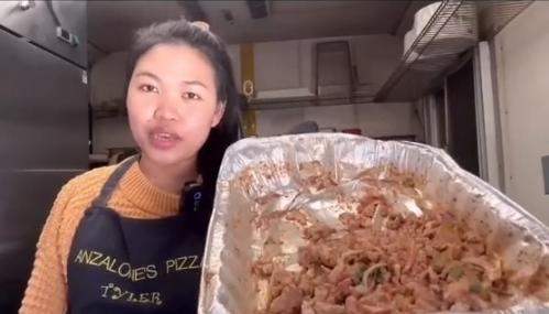 โดยในคลิป เธอรับงานไปตั้งร้านพิซซ่าแบบฟูดทรัก ในไซต์ก่อสร้างคนงานชาวเม็กซิกัน โดยพิซซ่าหน้าต่างๆ มีอยู่ในเมนูอย่างครบถ้วน แต่เธอยังทำพิซซ่าหน้าพิเศษนอกเหนือจากในเมนู เป็น พิซซ่าหน้าลาบ ซึ่งเธอให้คนงานในไซต์ลองชิม ปรากฎว่าหลายคนติดใจสุดๆ ย้อนกลับมาสั่งตามๆ กันอีกหลายรอบ
