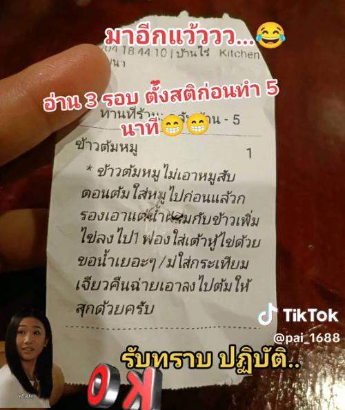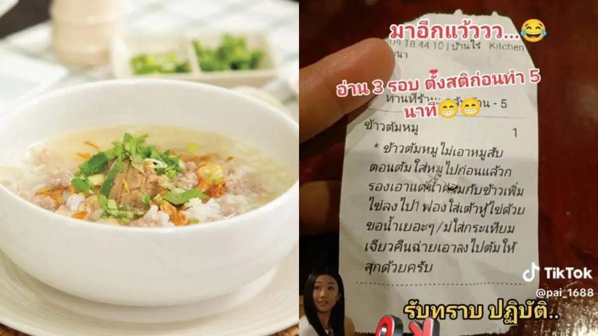 โดยมีการเขียนหมายเหตุมาแบบจัดเต็ม ระบุว่า “ข้าวต้มหมูไม่เอาหมูสับ ตอนต้มใส่หมูไปก่อนแล้วกรองเอาแต่น้ำผสมกับข้าวเพิ่มไข่ลงไป 1 ฟอง ใส่เต้าหู้ไข่ด้วย ขอน้ำเยอะๆ ไม่ใส่กระเทียมเจียว ขึ้นฉ่าย เอาลงไปต้มให้สุกด้วยครับ”