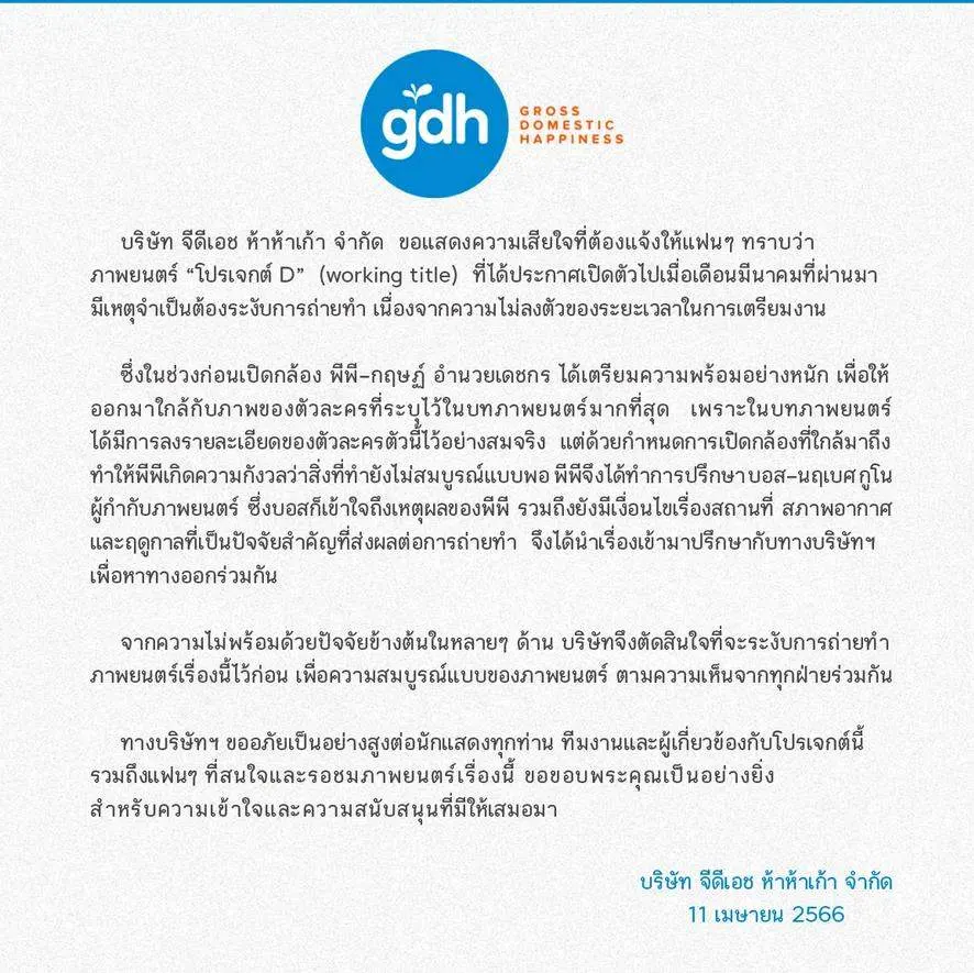 หลังจากที่ทาง GDH ได้ร่อนจดหมายแจ้งข่าวว่า ภาพยนตร์เรื่อง โปรเจกต์ D (Working Title) ที่ได้วางตัวนักแสดงไว้คือ พีพี กฤษฏ์ อำนวยเดชกร กับ อิงฟ้า วราหะ และได้เปิดตัวไปเมื่อเดือน มี.ค. ที่ผ่านมา ต้องระงับการถ่ายทำ เหตุเพราะความไม่พร้อมของตัวนักแสดงและความไม่ลงตัวของระยะเวลาในการเตรียมงาน