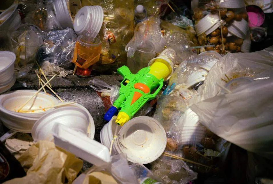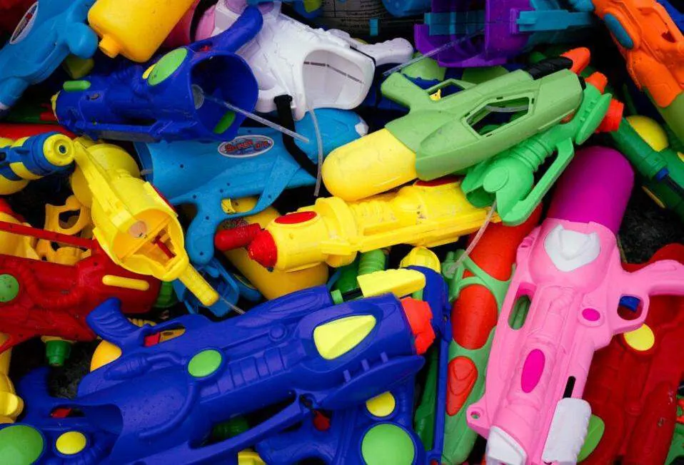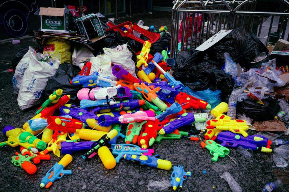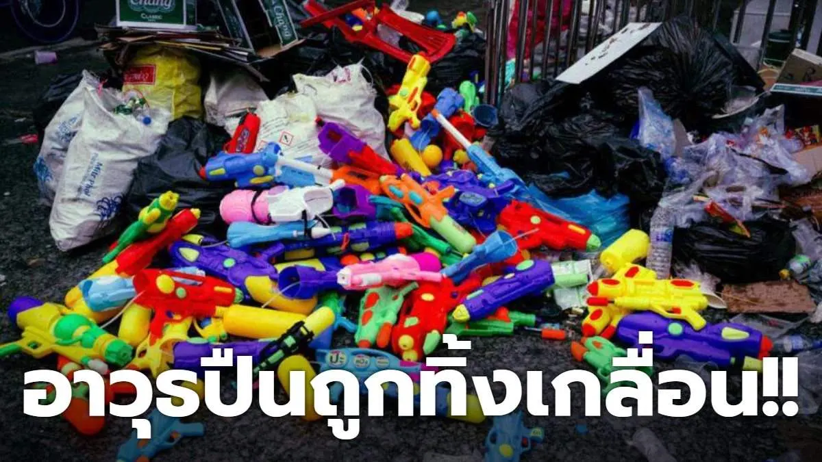บันทึกภาพ! โศกนาฏกรรมหลังสงกรานต์ ปืนฉีดน้ำจำนวนมากถูกทิ้งเป็นขยะเกลื่อนกลาด บนถนนข้าวสาร