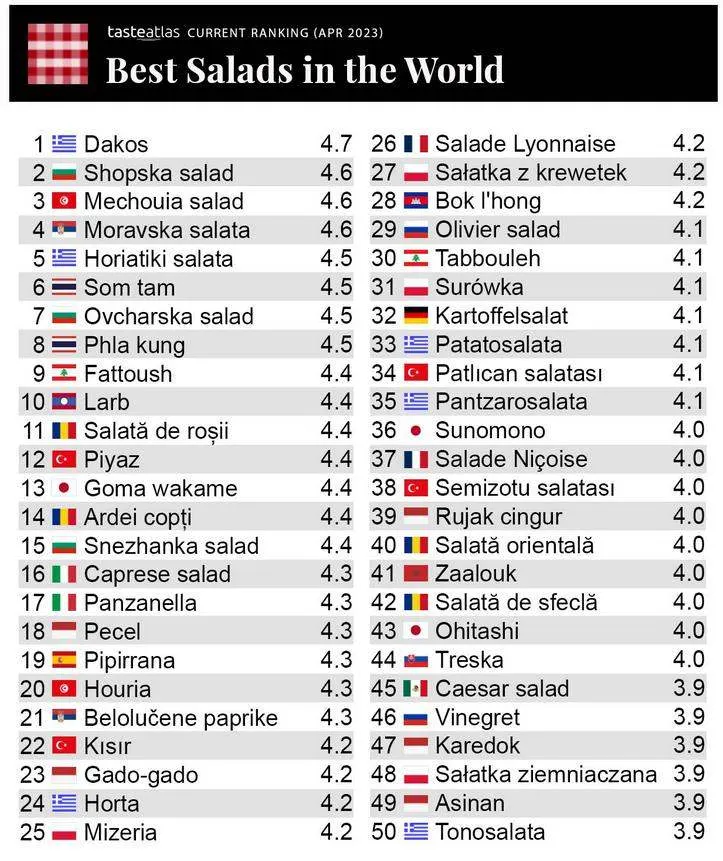 TasteAtlas เว็บไซต์รวบรวมสูตรอาหารและรีวิวจากนักวิจารณ์อาหารทั่วโลก ได้จัดอันดับ 100 Best-Rated Salads in the World ที่เป็นการจัดอันดับเมนูสลัดจากทั่วโลกที่ได้รับคะแนนรีวิวจากทั่วโลกมากที่สุด โดยเมนูของไทยอย่าง “ส้มตำ” ได้รับคะแนนรีวิว 4.5 คะแนน อยู่ในอันดับที่ 6 ส่วนเมนู “พล่ากุ้ง” ได้ 4.5 คะแนน อยู่ในอันดับที่ 8
