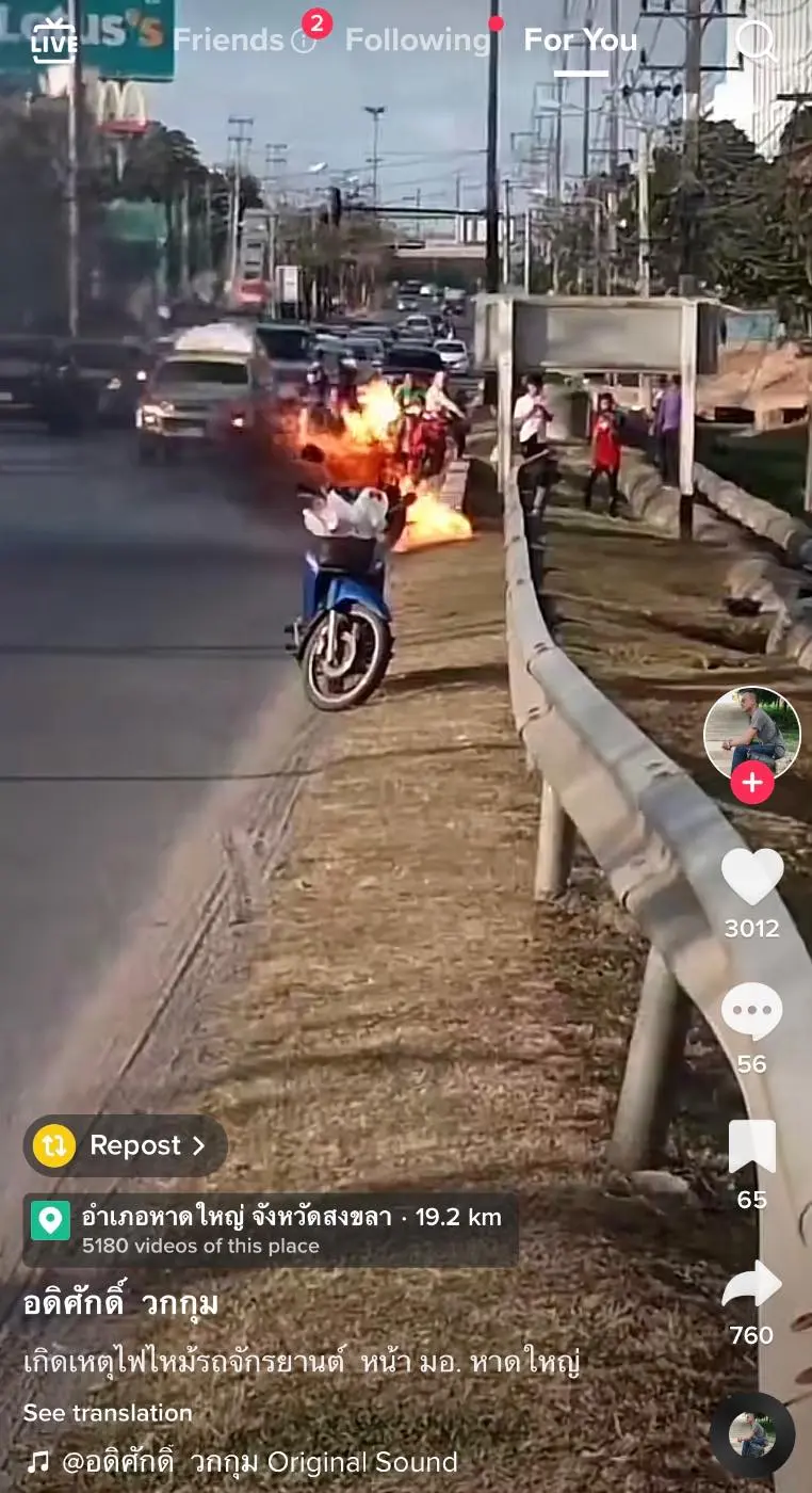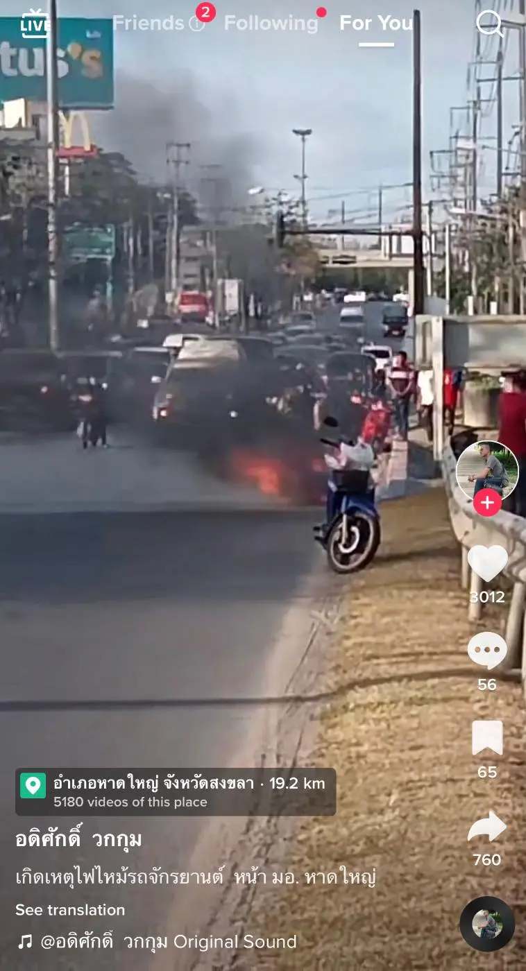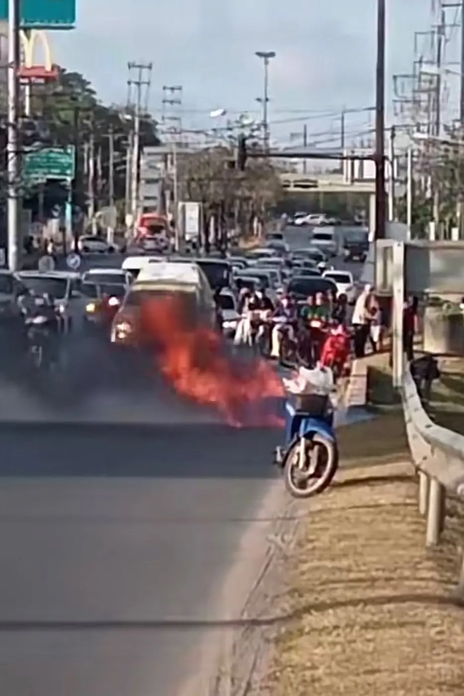 หาดใหญ่ ร้อนจนมอไซต์ ระเบิดไฟลุกท่วมบริเวณ หน้าโรงพยาบาลสงขลานครินทร์ อำเภอหาดใหญ่ จังหวัดสงขลา อากาศร้อน 34 องศา