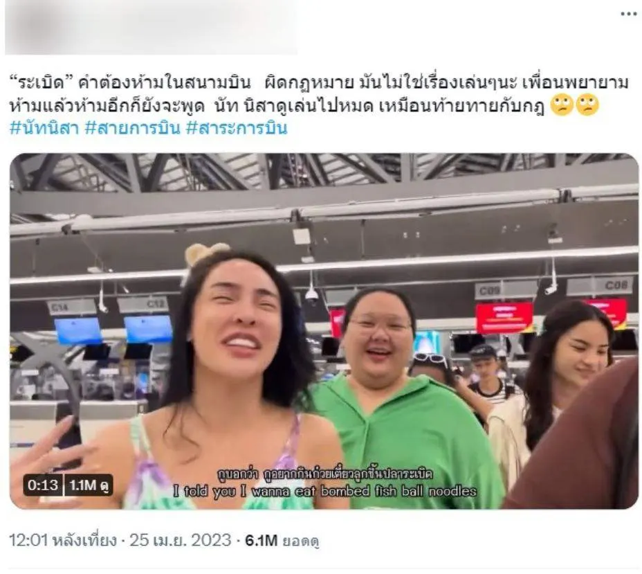 “ระเบิด” คำต้องห้ามในสนามบิน ผิดกฏหมาย มันไม่ใช่เรื่องเล่นๆนะ เพื่อนพยายามห้ามแล้วห้ามอีกก็ยังจะพูด นัท นิสาดูเล่นไปหมด เหมือนท้ายทายกับกฎ 🙄🙄 #นัทนิสา #สายการบิน #สาระการบิน pic.twitter.com/rWVgjo3V79