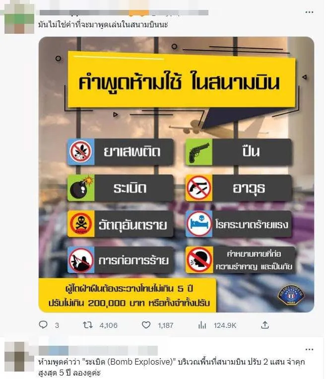 ซึ่ง คำว่า ‘ระเบิด’ ห้ามพูดในสนามบิน มีโทษจำคุกไม่เกิน 5 ปี ปรับไม่เกิน 200,000 บาท หรือทั้งจำทั้งปรับ