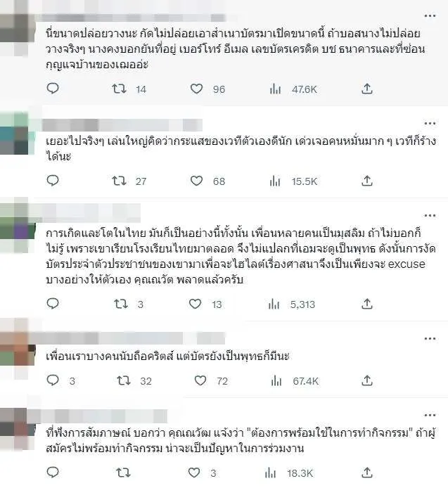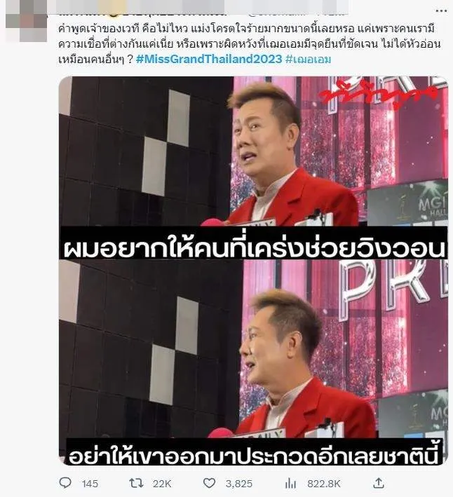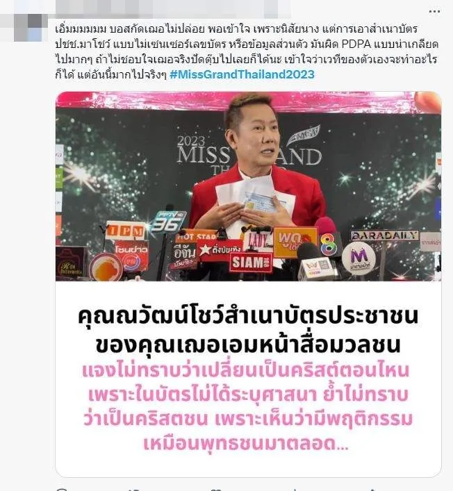 บอสกัดเฌอไม่ปล่อย พอเข้าใจ เพราะนิสัยนาง แต่การเอาสำเนาบัตรปชช.มาโชว์ แบบไม่เซนเซอร์เลขบัตร หรือข้อมูลส่วนตัว มันผิด PDPA แบบน่าเกลียดไปมากๆ ถ้าไม่ชอบใจเฌอจริงปัดตุ๊บไปเลยก็ได้นะ เข้าใจว่าเวทีของตัวเองจะทำอะไรก็ได้ แต่อันนี้มากไปจริงๆ #MissGrandThailand2023 บ้างก็บอกว่าคำพูดเจ้าของเวที