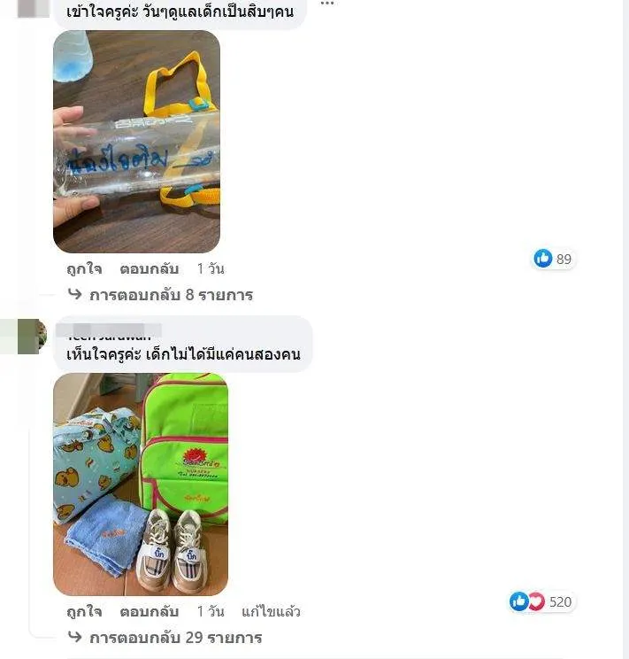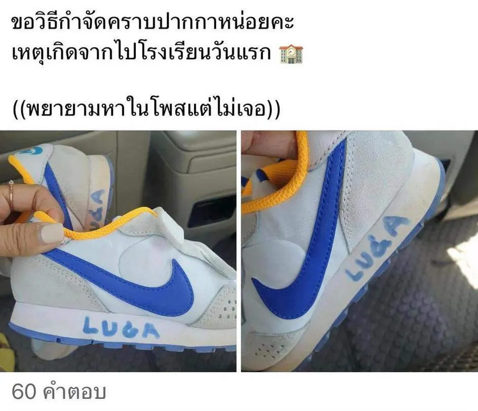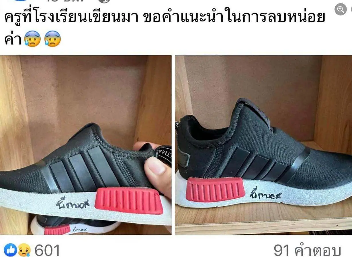 ล่าสุด แม่ก็ทำตามคำแนะนำจากชาวเน็ต แต่ยังลบไม่ออก คาดว่าตนเองน่าจะเขียนชื่อเล็กไป ครูเลยมองไม่เห็น ขณะเดียวกันก็มีผู้ปกครองอีกรายหนึ่ง ร้องเพจดังว่า “คุณครูใช้ปากกาเมจิกเขียนที่รองเท้าผ้าใบ!”