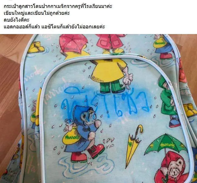 แม่รายหนึ่งโพสต์ถามในกลุ่มว่า “กระเป๋าลูกสาวโดนปากกาเมจิกจากครูที่โรงเรียนมาค่ะ เขียนใหญ่และเขียนไม่ถูกด้วยค่ะ ลบยังไงดีคะ แอลกอฮอล์ก็แล้ว แอซิโตนก็แล้วยังไม่ออกเลยค่ะ”