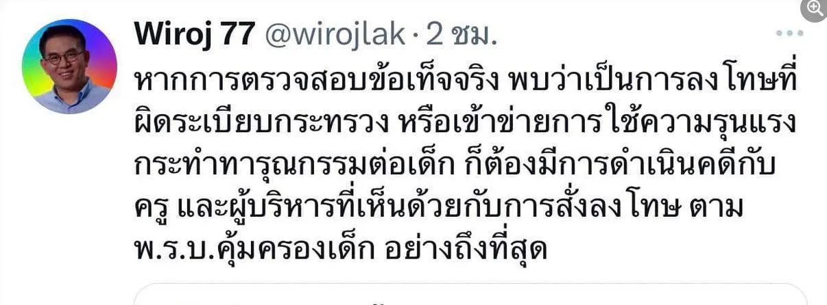 นายวิโรจน์ ลักขณาอดิศร สส.พรรคก้าวไกล ทวิต "หากการตรวจสอบข้อเท็จจริง พบว่าเป็นการลงโทษที่ผิดระเบียบกระทรวง หรือเข้าข่ายการใช้ความรุนแรงกระทำทารุณกรรมต่อเด็ก ก็ต้องมีการดำเนินคดีกับครู และผู้บริหารที่เห็นด้วยกับการสั่งลงโทษ ตาม พ.ร.บ.คุ้มครองเด็ก อย่างถึงที่สุด"