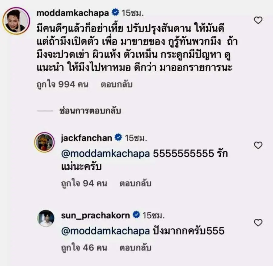 แต่พีกที่สุดหนีไม่พ้น พี่คนสนิทอย่าง มดดำ คชาภา ที่เข้ามาคอมเมนต์อวยพรด้วยข้อความปรี๊ดสุดๆ ว่า“มีคนดีๆแล้วก็อย่าเ...้…. ปรับปรุงสันดานให้มันดี แต่ถ้ามึงเปิดตัวเพื่อมาขายของ กูรู้ทันพวกมึง ถ้ามึงจะปวดเข่า ผิวแห้ง ตัวเหม็น กระดูกมีปัญหา กูแนะนำให้มึงไปหาหมอดีกว่ามาออกรายการนะ” ขณะที่ ดีเจดาด้า เห็นคอมเมนต์มดดำแล้วถึงกับต้องมาตอบว่า “เป็นคำอวยพรที่สะเทือนโลกมากๆ”