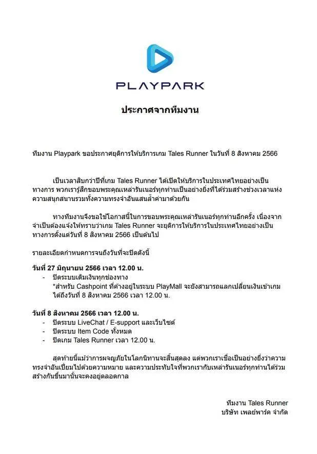 ทางค่าย PlayPark ได้เผยประกาศสำคัญถึงการยุติการให้บริการเกม Tales Runner ในประเทศไทย ในวันที่ 8 สิงหาคม 2023 เป็นต้นไป โดยมีลำดับขั้นตอนการปิดบริการดังนี้