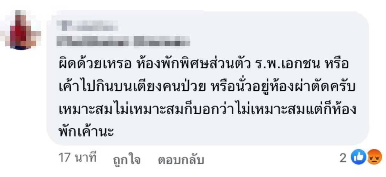 ผู้ใช้ทวิตเตอร์ @RedSkullxxx ได้เผยภาพของสมาชิกผู้ใช้เฟซบุ๊กรายหนึ่ง เป็นภาพในห้องพักผู้ป่วยในโรงพยาบาลแห่งหนึ่งใน จ.สมุทรปราการ โดยระบุข้อความว่า "คนรวยทำอะไรก็ไม่น่าเกลียดใช่ปะ"