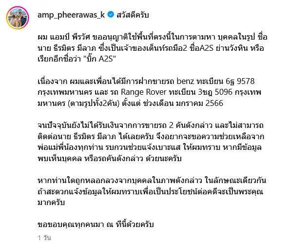 นักแสดงหนุ่มหล่อ "แอมป์ พีรวัศ กุลนันท์วัฒน์" โพสต์ไอจีตามหาเจ้าของเต๊นท์รถยนต์มือสอง ย่านวังหิน หลังได้ฝากขายรถเบนซ์กับเต็นท์ดังกล่าว แต่ผ่านมานานแล้วยังไม่ได้รับเงิน โดยระบุข้อความว่า "สวัสดีครับ ผม แอมป์ พีรวัศ ขออนุญาตใช้พื้นที่ตรงนี้ในการตามหา บุคคลในรูป ชื่อ นาย..... ซึ่งเป็นเจ้าของเต็นท์รถมือ2 ย่านวังหิน