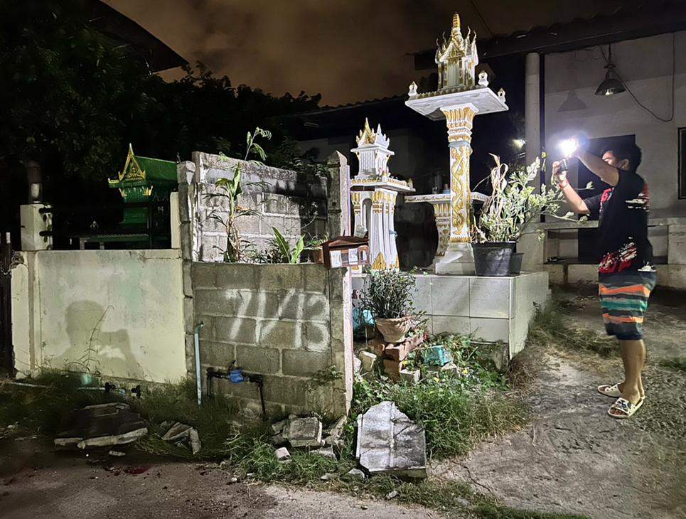 สอบถามพ่อค้าขายลูกชิ้นทราบว่า ก่อนเกิดเหตุคนเจ็บมาซื้อลูกชิ้น แต่ด้วยความที่กลัวสุนัขกัด จึงปีนขึ้นไปอยู่บนกำแพง ซึ่งอยู่สูงเทียมศาลพระภูมิเจ้าที่ ตนก็เตือนแล้วว่า อย่าปีนข้ามศาลพระภูมิ ระวังจะตกลงมานะ จังหวะที่ทอดลูกชิ้นเสร็จ กำแพงล้มทับร่างเด็กจนได้รับบาดเจ็บ