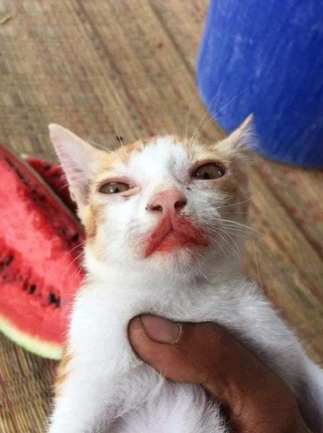 ผู้ใช้ทวิตชื่อ Pienar ได้แชร์เรื่องราวแมวส้มของเขาที่ย่องเข้าไปแอบกินแตงโม แต่พอจับพลิกมาดูปากน้องแดงแจ๋เหมือนทาลิปสติกอยู่ ว่าแล้วก็อย่าลืมบำรุงเจ้าส้มให้แข็งแรง