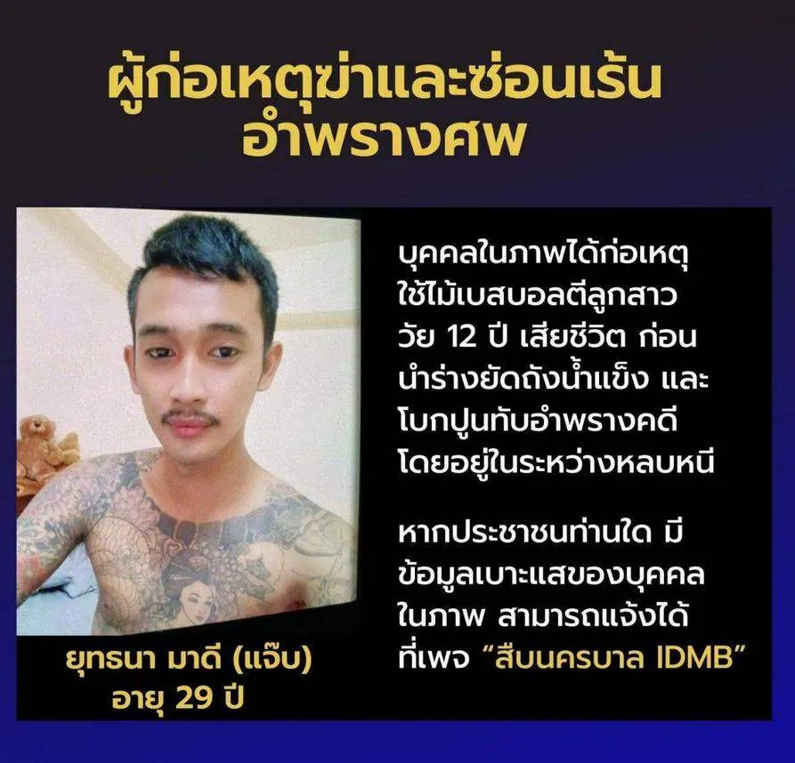 ตร.สืบนครบาล ประกาศขอประชาชนแจ้งเบาะแส “เจ้าหน้าที่สืบสวน ตำรวจนครบาล กำลังติดตามตัว นายยุทธนา มาดี (แจ๊บ) อายุ 29 ปี (บุคคลตามภาพ) ซึ่งได้ก่อเหตุ ใช้ไม้เบสบอลตีลูกสาว วัย 12 ปี เสียชีวิต ก่อนนำร่างยัดถังน้ำแข็ง และโบกปูนทับเพื่ออำพรางคดี โดยอยู่ในระหว่างหลบหนี