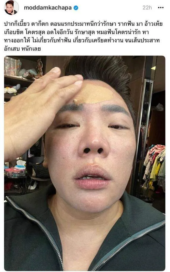 ต้องรักษาอย่างน้อย 3-4 สัปดาห์ขึ้นไป ถึงจะเริ่มมีฟังก์ชันกลับมาบ้าง แล้วประมาณ 3 เดือนถึงจะเริ่มเข้าสู่ภาวะปกติ มดดำเล่าในรายการแฉว่า “ปากเบี้ยวตอนนี้ฉีดยารักษาอยู่ เกิดจากพักผ่อนน้อย นอนไม่เพียงพอ เครียด ทำงานเยอะเกิน มันก็มีโอกาส”
