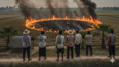 ชาวนากัมพูชาผิดหวังจนต้องเผาข้าวทั้งนา – เมื่อเศรษฐกิจพึ่งไทยจนวันหนึ่งไทยปิดด่าน…ทุกอย่างพังเป็นโดมิโน!” 🔥