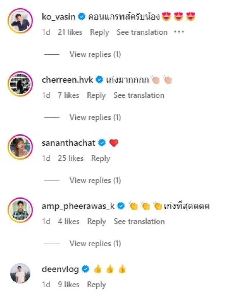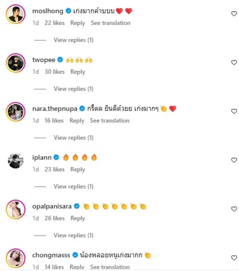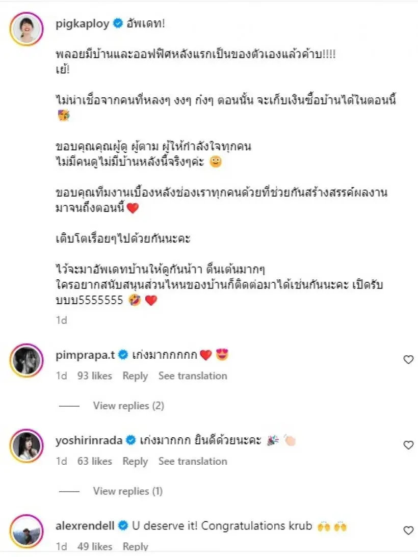 เหล่าดาราเพื่อนพ้องต่างพากันเข้ามาคอมเมนต์แสดงความยินดีและชื่นชมบ้านหลังใหม่ของพลอยกันอย่างล้นหลาม ซึ่งสะท้อนให้เห็นถึงมิตรภาพอันดีของเหล่าคนในวงการบันเทิง