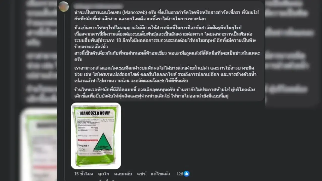 หญิงสาวได้โพสต์ในกลุ่มออนไลน์เกี่ยวกับการพบคราบสีฟ้าบนพริกที่เธอซื้อมาเพื่อทำพริกแห้ง โดยเธอสงสัยว่าสิ่งที่เห็นคืออะไร หลังจากที่มีการสอบถามในกลุ่ม มีผู้เข้ามาแสดงความคิดเห็นและช่วยกันหาคำตอบ จนกระทั่งพบว่าคราบสีฟ้านั้นคือสารแมนโคเซบ ซึ่งเป็นสารกำจัดเชื้อราที่ถูกแบนในยุโรปเนื่องจากความเสี่ยงต่อสุขภาพ.