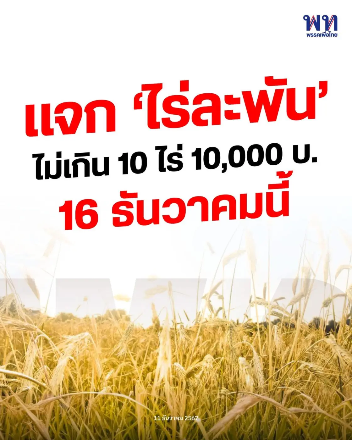 ‘เพื่อไทย’ โพสต์ ไทม์ไลน์ ธ.ก.ส.เริ่มจ่ายเงิน ‘ไร่ละ 1,000 บาท’ ให้ชาวนา 4.3 ล้านราย วงเงิน 3.5 หมื่นล้านบาท เริ่มจันทร์ที่ 16 ธ.ค.นี้ 🎉👍🏻