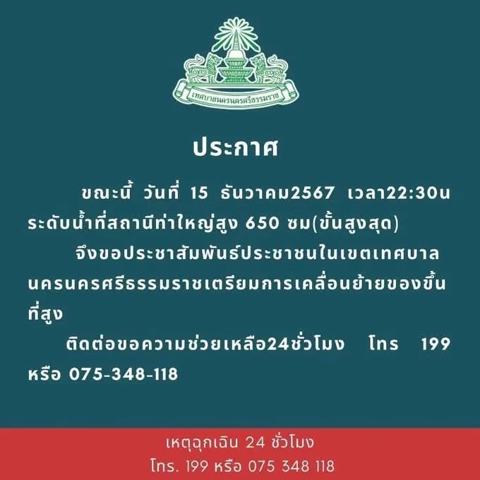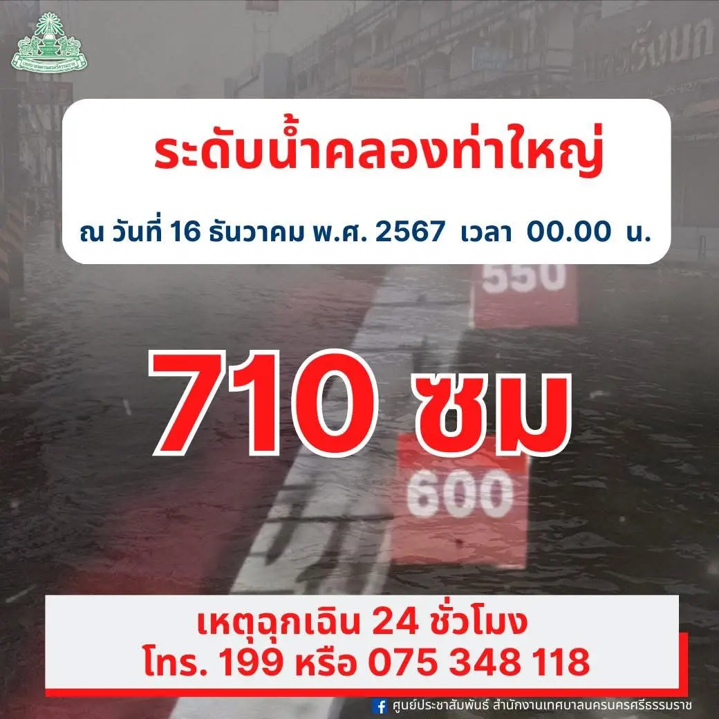 นครศรีธรรมราช สถานการณ์น้ำท่วมระลอกใหม่ จากฝนที่ตกติดต่อกันพร้อมต้องรับน้ำจากเทือกเขาหลวง ผู้อยู่อาศัยอยู่พื้นที่น้ำท่วมซ้ำซากในเขตเทศบาลนครนครศรีธรรมราช และพื้นที่บริเวณรอบนอกอำเภอเมือง เตรียมรับสถานการณ์ ขนย้ายสิ่งของ/เคลื่อนย้ายกลุ่มเปราะบางไปที่ปลอดภัย สอบถามโทร 1784