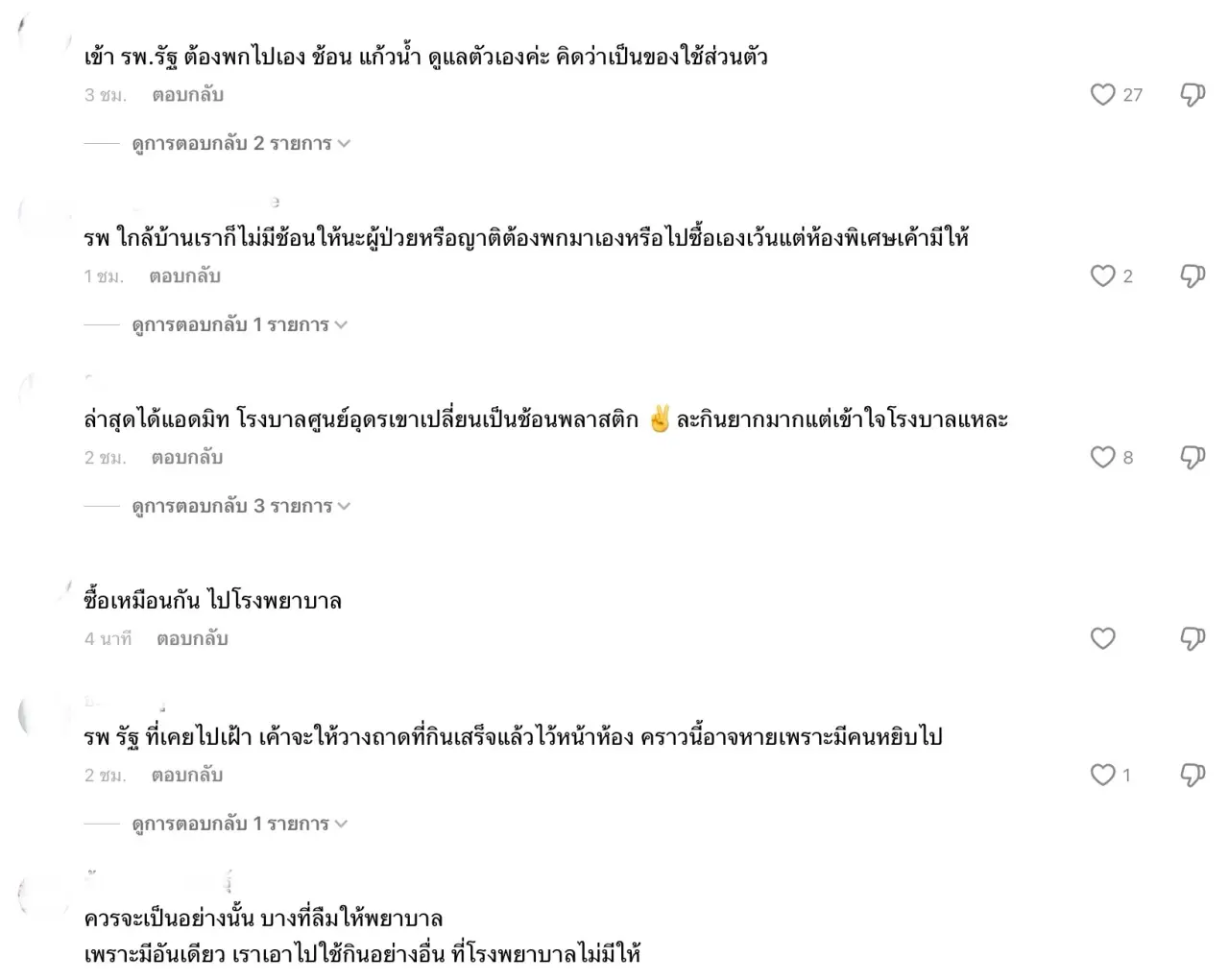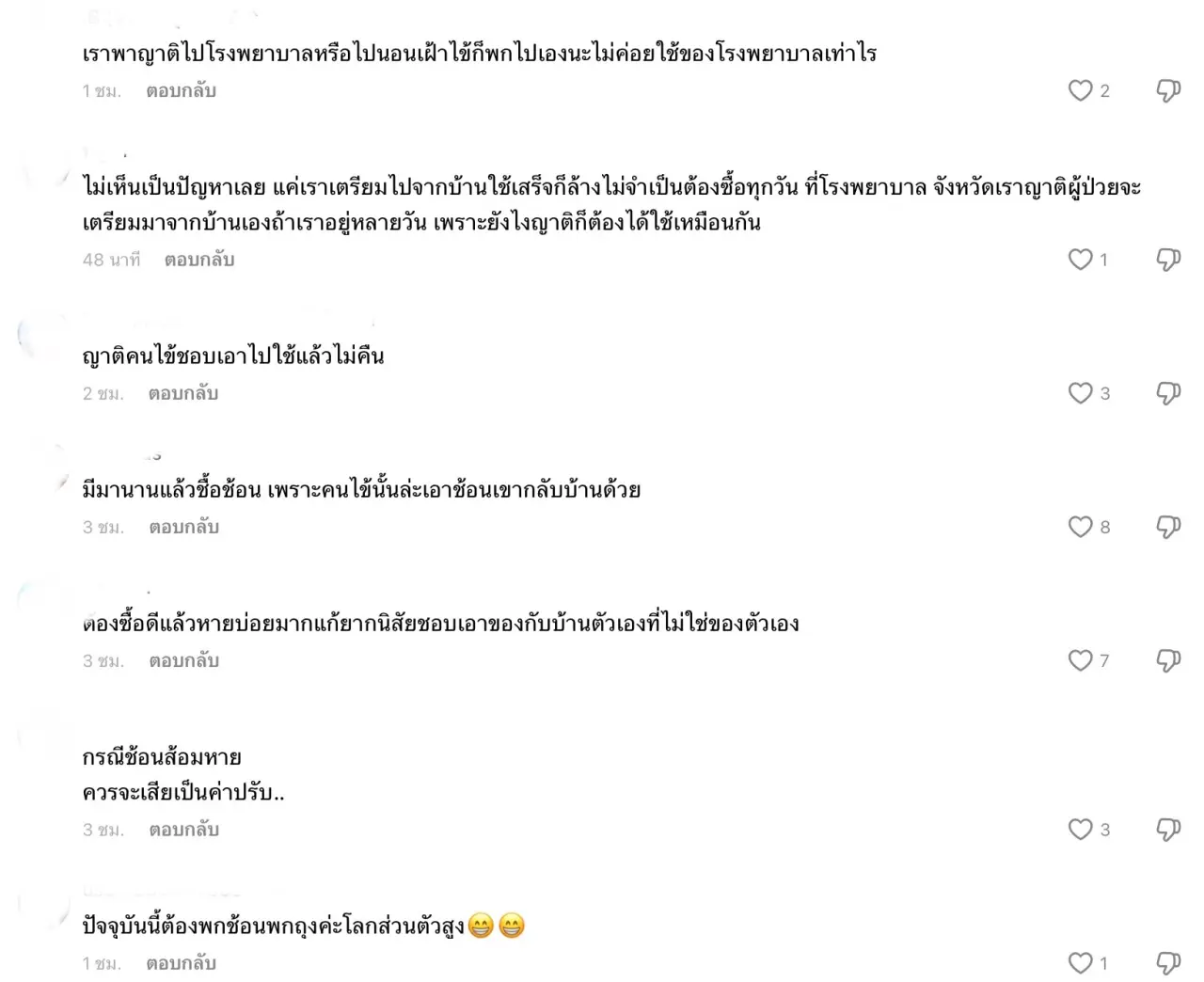 อีกมุมนึงมองว่าปกติช้อนส้อมเป็นของใช้ส่วนตัว ที่ทางคนไข้หรือทางญาติต้องเตรียมมาเอง ซึ่งหลายๆ รพ. ก็ใช้วิธีนี้ สาเหตุหลักๆ มาจาก “คนไข้และญาติขโมยเอาช้อนกลับบ้านด้วย” ทำให้ช้อนส้อมที่มีไว้สำหรับบริการอาหาร “หายรายวัน” เป็นทุกที่ไม่ว่าจะโรงพยาบาลรัฐและเอกชน