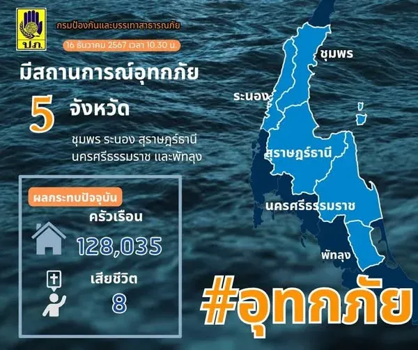 (16 ธ.ค. 67) เวลา 10.00 น. ปภ.เผยมีสถานการณ์อุทกภัยใน 5 จังหวัด ได้แก่ ชุมพร ระนอง สุราษฎร์ธานีนครศรีธรรมราช และพัทลุง รวม 47 อำเภอ 274 ตำบล 1,998 หมู่บ้าน ประชาชนได้รับผลกระทบ 128,035 ครัวเรือน มีผู้เสียชีวิต 8 ราย เจ้าหน้าทีหน้าที่ชุดปฏิบัติการพร้อมเครื่องจักรกลสาธารณภัย เร่งสูบระบายน้ำออกจากพื้นที่ช่วยเหลือและบรรเทาความเดือดร้อนของประชาชนที่ได้รับผลกระทบ