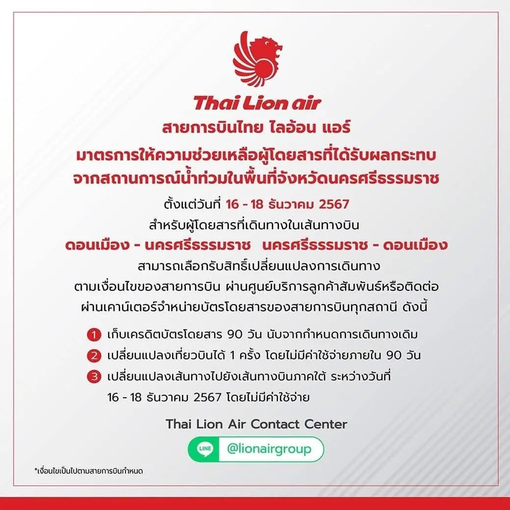 ตั้งแต่วันที่ 16-18 ธันวาคม 2567 สำหรับผู้โดยสารที่เดินทางในเส้นทางบิน ดอนเมือง-นครศรีธรรมราช นครศรีธรรมราช-ดอนเมือง